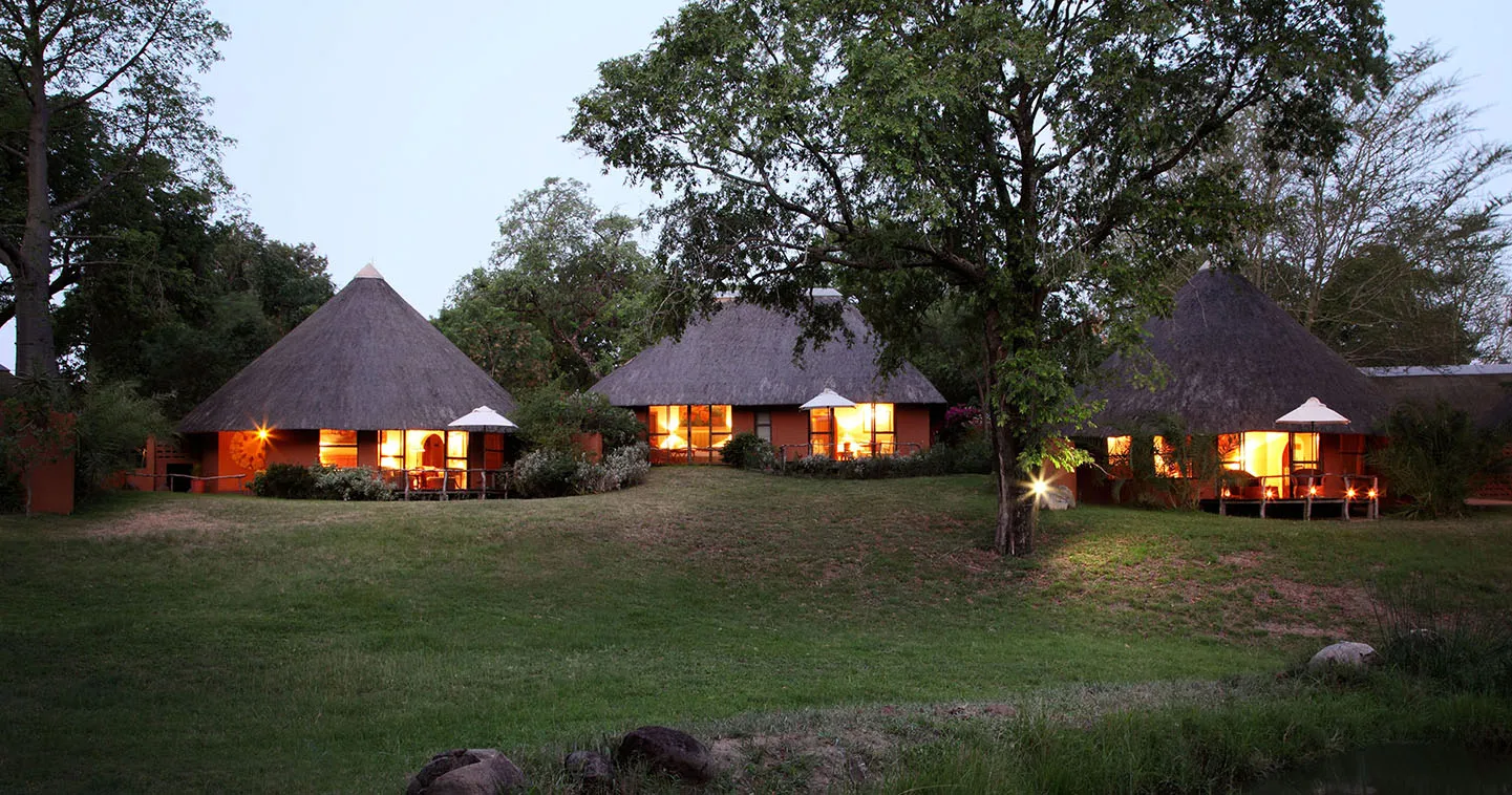 Meandering pathways lead you through ancient trees and soft green lawns, revealing warm ochre-colored suites nestled in lush foliage that lines the majestic Sand River.